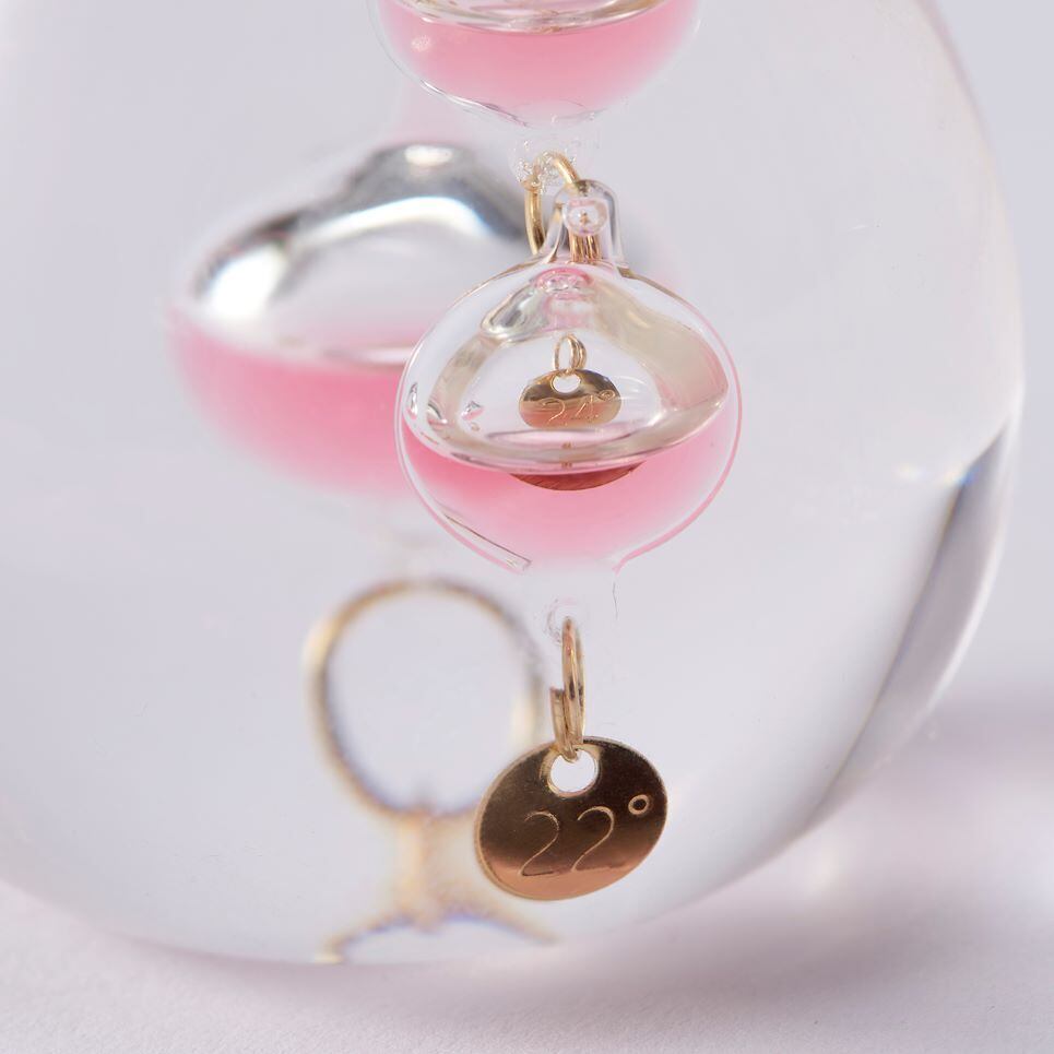 物理学者のガリレオ・ガリレイは液体の比重が気温によって変化することを発見。その原理を使ってこの温度計は作られております。