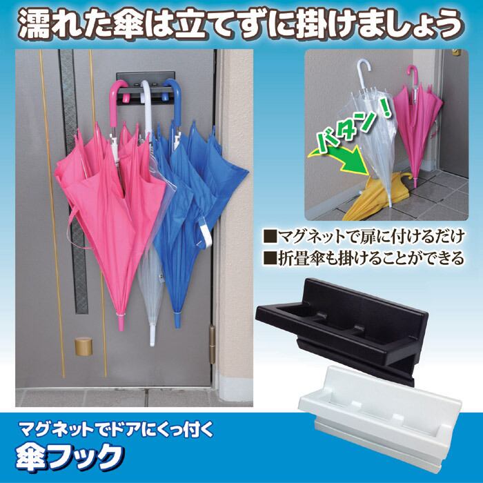 濡れた傘は置き場所に困って、ついつい立て掛けてしまいます。気がつくと地面に倒れていた、なんてこともありますよねぇ。びしょ濡れの傘を玄関内に入れると床が濡れてしまいます。本製品は、扉の外側に取り付けることで、傘を掛けることができるアイデアグッズ。これなら倒れてしまったり、玄関内の床がびしょ濡れになることはありません。3本まで掛けられ、折畳傘(ヒモが付いているタイプ)も2本まで掛けることができます。取り付けはマグネット式で鉄製扉はそのままポンっと付けるだけ。他の素材に対しては付属の鉄プレートを取り付けてご使用いただけます。使わない時は、家の中に入れておけます。