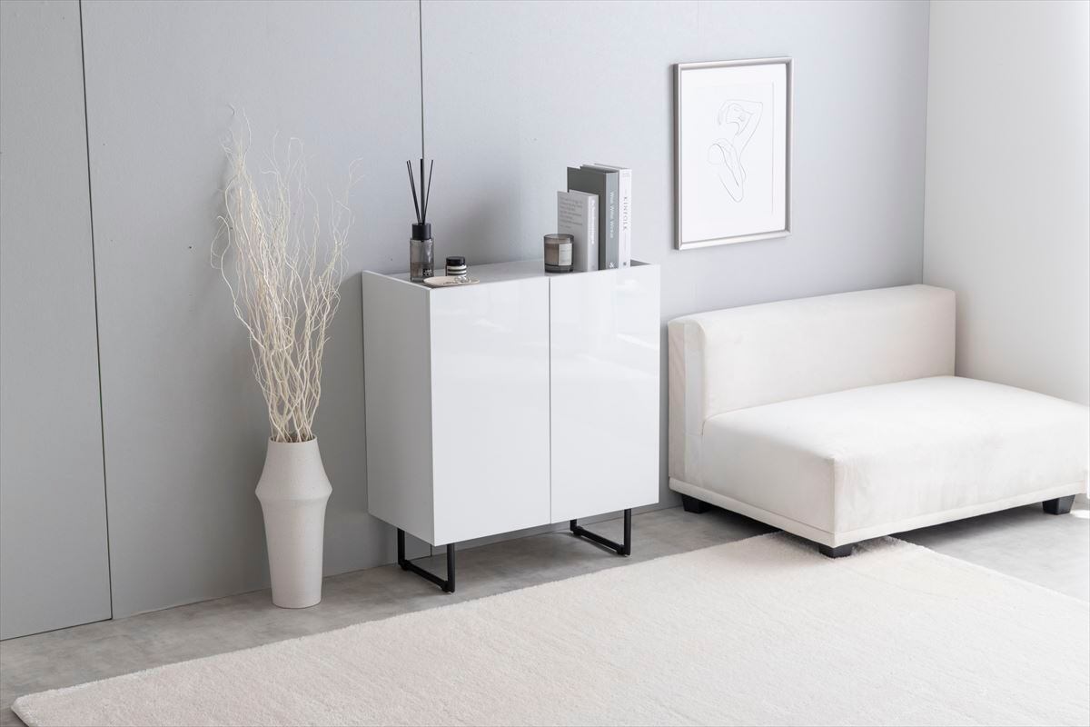 【ホワイト】本体:パーティクルボード、天板:メラミンシート貼り、扉:鏡面貼り、側面:紙貼り