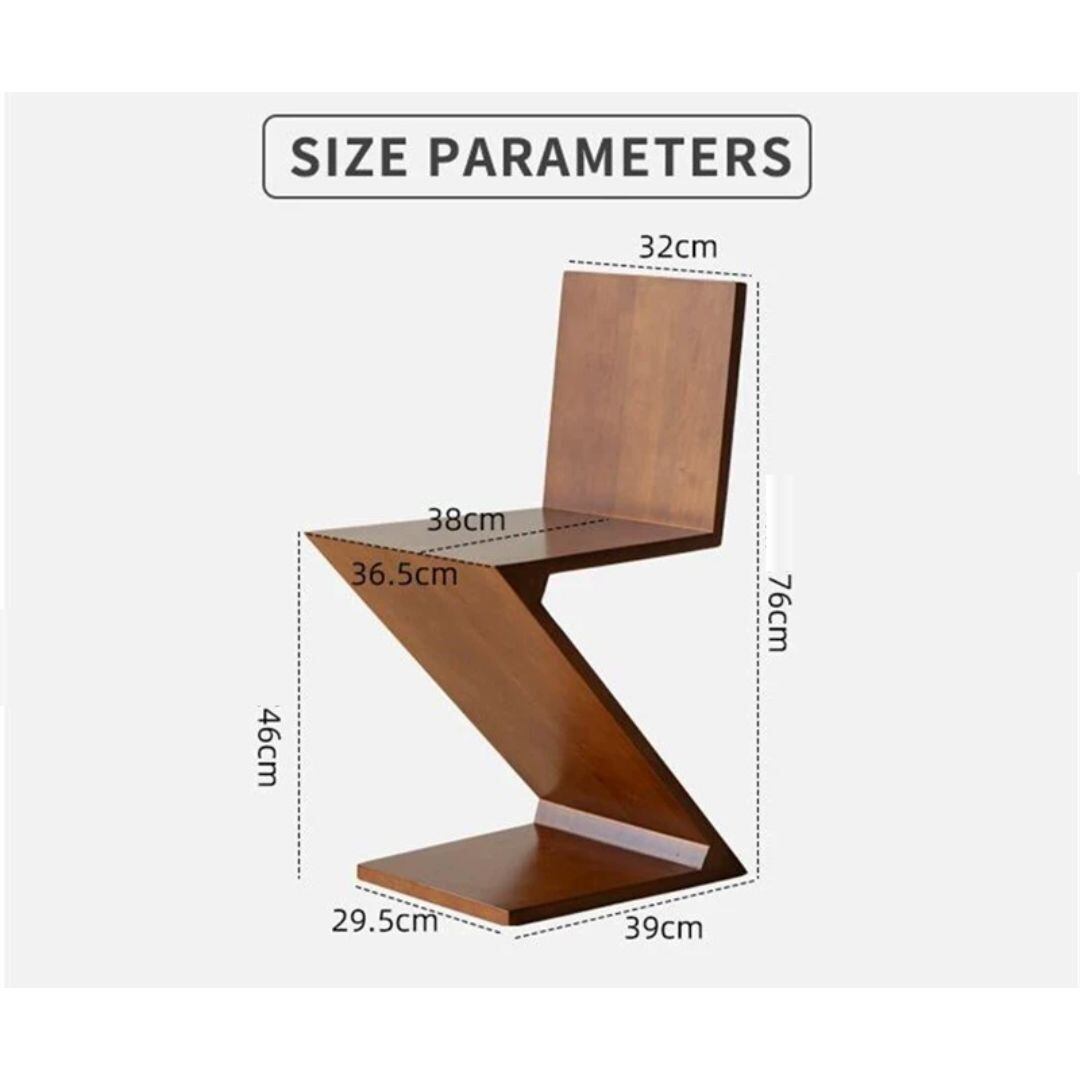 ジグザグチェアは、色使いや幾何学的・モンドリアン的デザインでデ・ステイルを代表する建築、シュレーダー邸のためにデザインされたものであり、リートフェルトの代表作でもあります。リートフェルトのデザインは、直線を利用し水平方向・垂直方向へ構成されたものが多数あります。このジグザグチェアはその名の通り「Z」の形をしており、このZを逆にしたような形は、背部・座部・支持部・底面の4つの木材がリズミカルに連なっています