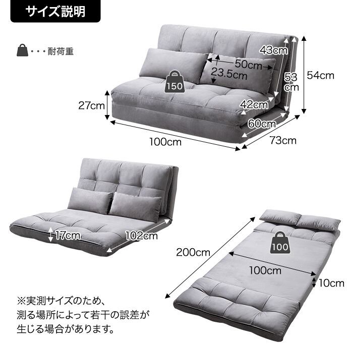 【耐荷重】ソファ時:約150kg、ベッド時:約100kg